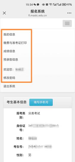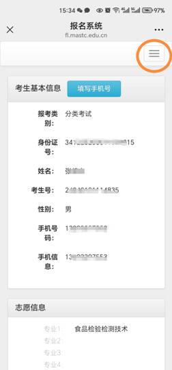 使用手机端登录,显示界面可能与电脑端有所不同。如果考生登录进入系统后,没有找到菜单栏目,请在手机显示界面右上端,找到并点击“三条短横线”(由于手机系统差异,此栏目显示各有形状,请注意仔细观察)后,根据出现的下拉菜单,找到相应操作按钮,按流程进行操作。