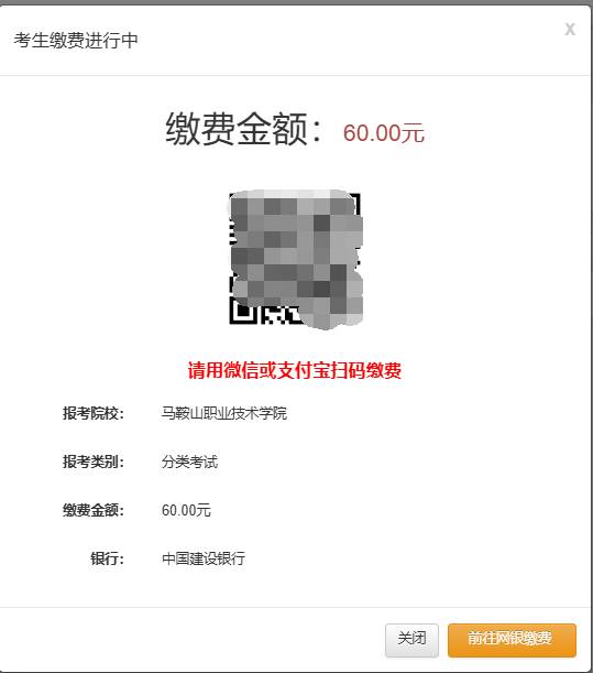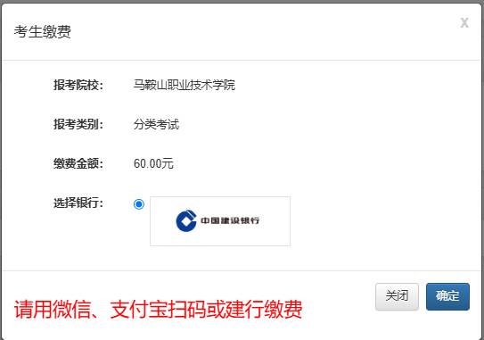 注意:本次缴费支持使用微信、支付宝或建行网银缴费。不支持其它支付方式!