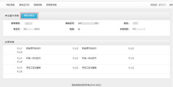 登录成功后请核对基本信息和志愿信息,并填写用于校考测试的手机号码(此手机号码非常重要,请务必谨慎填写),手机号码一旦保存,将不能修改,请仔细核对。请勿更换手机号码,并确保通信畅通。