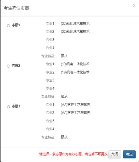 如考生多次填报我院志愿,请选择其中一条志愿信息进行确认。考生确认的志愿信息将作为报考我院的唯一有效志愿,将根据志愿信息安排相应类型或模块校考测试,并根据测试成绩进行预录取与递补预录取(兼报普通计划与退役军人专项计划、革命老区建档立卡专项计划的考生,请特别注意志愿信息确认无误)。志愿信息一旦确认,不可更改,请务必谨慎操作!